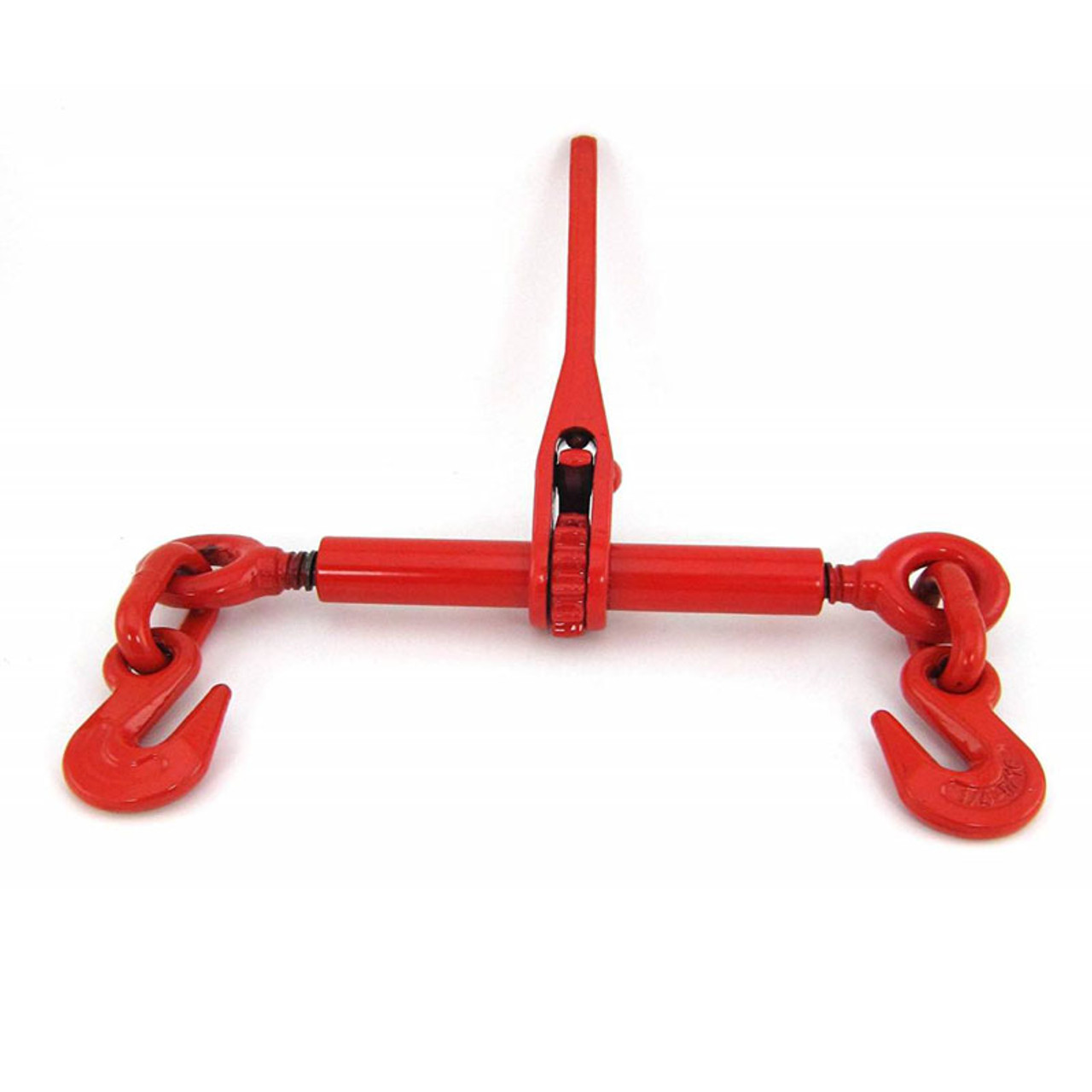 Constructed of drop forged steel for strength and durability and designed to be used with transport chain. Finished in a red E-coat paint. Pinned barrel. One piece handle with ball and lever release mechanism. Built-in thread stops to prevent over extension of threads and loss of load carrying capacity. They meet or exceed WSTDA T-6 standards. Accepts chain from 3/8 in G70 up to 1/2 in G43.