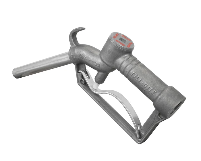 Fill-Rite aluminum manual nozzle with integral hanging hook. Designed for gasoline and diesel. Includes Viton seals and O-rings for smooth valve operation. One year warranty. This nozzle is UL/cUL. Made in USA.