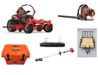The GH4228 Red Rider Gravely Bundle includes a Gravely ZT X 52 Zero Turn Mower and a blower, trimmer, and chainsaw by Husqvarna, in addition to a Caliber trailer and a striping kit for professional results with each cut.