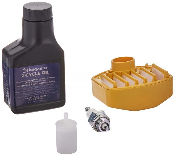 - Kit includes: (1) air filter, (1) fuel filter, (1) spark plug, (1) bottle of 2-cycle engine oil